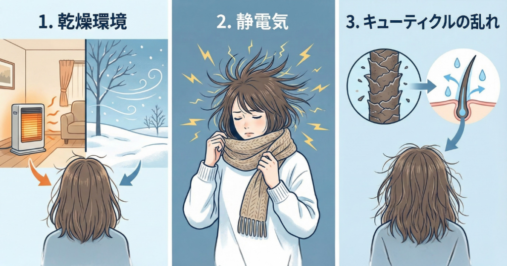 ここでは、冬特有のパサつきや広がりの主な原因を3つに分けて解説します。